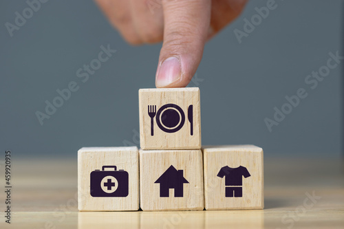 human hand placing cube with food Clothing, housing, medicine, four basic human needs concept.
