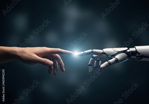 Human hand reaching out to touch a robot hand representing the connection of humans and artificial intelligence