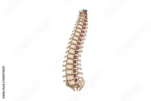 Human spine lateral view with red disc highlighting between vertebral segments, isolated on a transparent background
