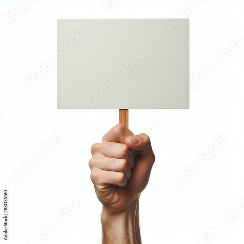 Human's hand raises a blank white cardboard sign isolated on a white background. hand holding blank paper with empty space