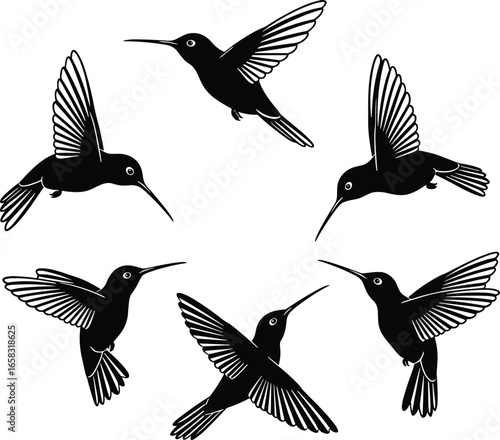 Hummingbird silhouette vector set, circular arrangement, flying bird poses, dynamic wing movement, wildlife illustration, nature art, decorative animal icons