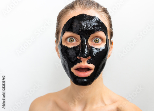 Humorous emotional young woman portrait with black mask on her face. Funny beauty spa treatment