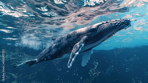 Humpback whale displays its magnificence in turquoise blue ocean.