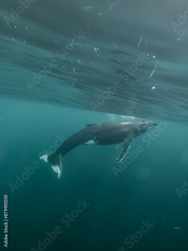 Humpback whale swimming, under the ocean surface.
