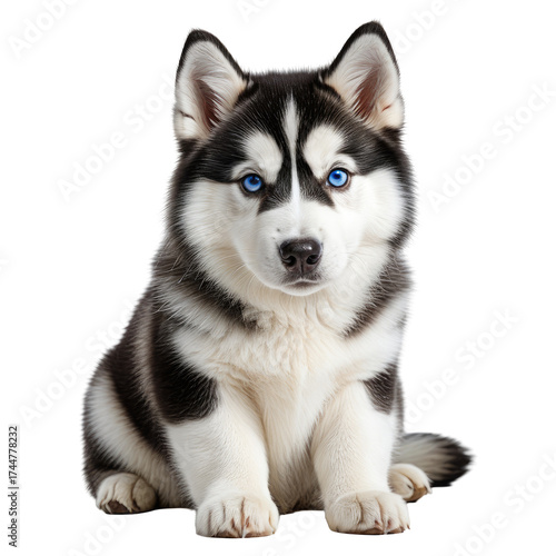 Husky puppy with bright blue eyes sits against a black background