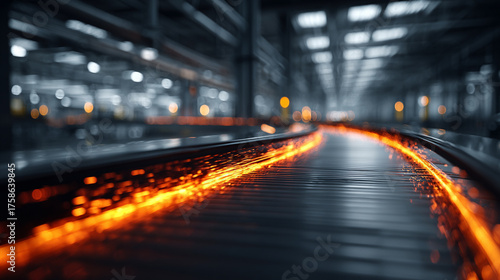 Hyperrealistic image of a moving conveyor belt with glowing edges, symbolizing automation, industrial technology, manufacturing process, and modern production efficiency.