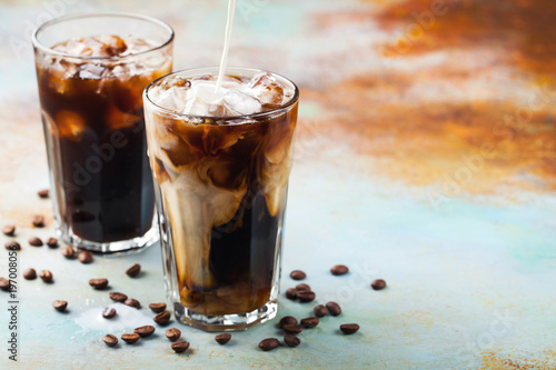 Ice coffee in a tall glass with cream poured over and coffee beans. Cold summer drink on a blue rusty background with copy space