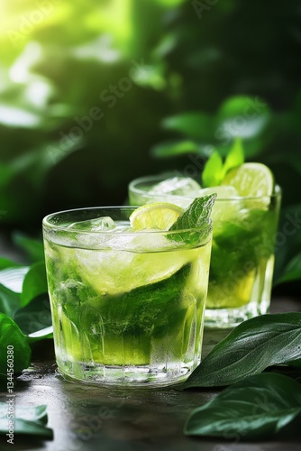 Ice cold mojito cocktail sits at the edge of a resort pool on a hot summer day