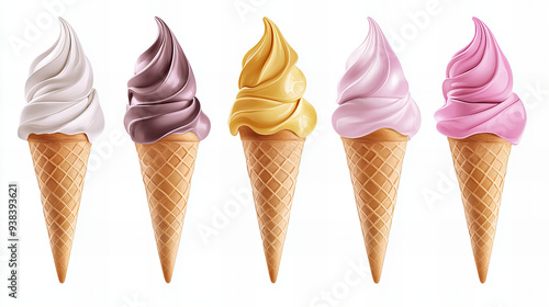 ice cream cones from a side view. The focus is on a variety of cones and cups, each topped with generous scoops of colorful ice cream