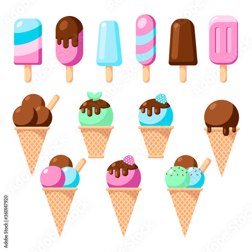 Ice cream cones with different topping vector set collection isolated on white background. Hand drawn colorful summer dessert set. illustration in fllat style. Design for banner,card, cafe, menu