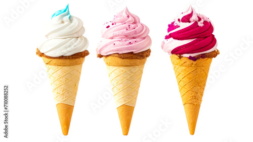 Ice cream on waffle cone isolated on white. Set of tasty ice-cream with assorted flavors, for design