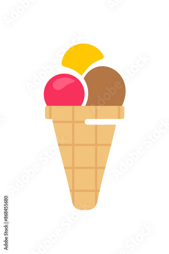 Ice cream scoops in waffle cones graphic design. Chocolate, vanilla, strawberry, banana ice cream