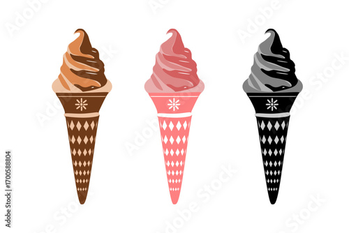 Ice cream vector set. Three chocolate and soft pink ice cream in a waffle cone. Melted ice cream
