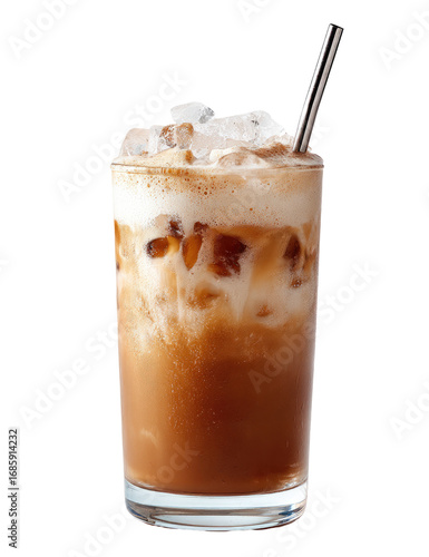 Iced coffee drink in a tall glass. Foamy top, ice cubes, brown liquid, metal straw