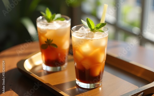 Iced coffee drinks cafe mint sunlit tray. High quality