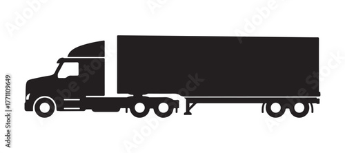 Icon of a truck tractor unit with a semi-trailer. It's a black silhouette seen from the side. A simple flat graphic illustration in vector format. The object is isolated on a white background. Isolate