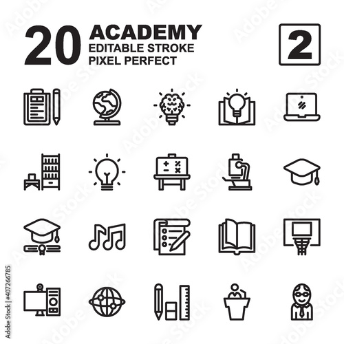 Icon Set of Academy. Outline style icon vector. Contains such of geography, hat graduation, music, exam, idea, knowledge, microscope, biology, professor, and more. Editable Stroke and Pixel perfect.