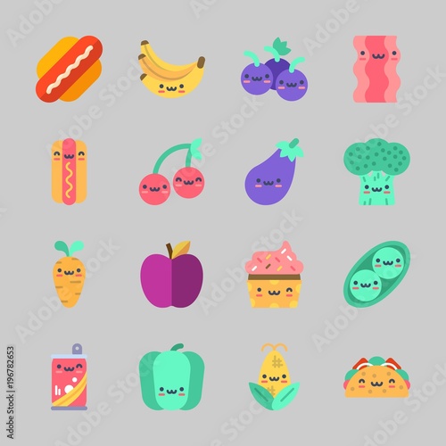 Icons about Food with broccoli, corn, apple, pea, carrot and bananas