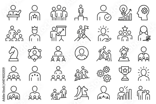 Icons of Leadership and Business: Collection of minimalist, linear icons on business concepts. Ideal for modern presentations, representing a range of professional elements.