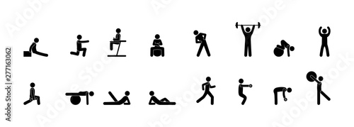 icons of people in the gym, fitness, yoga and strength exercises, set of silhouette isolated on white background, sports equipment and man illustration