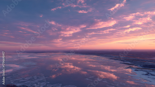 Icy lake mirroring pink sunset glow, cinematic aerial view and winter stillness
