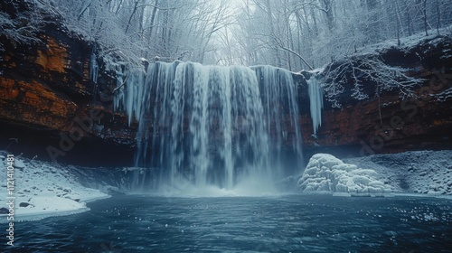 Icy Waterfall Surrounded by Trees in Winter Light