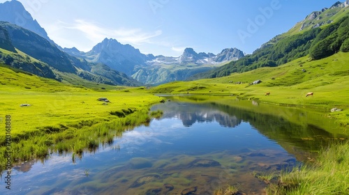 Idyllic alpine landscape reflecting on crystal clear lake with grazing cows