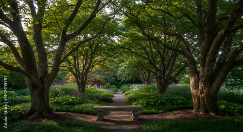 Idyllic Serenity In A Lush Landscape With Inviting Stone Bench