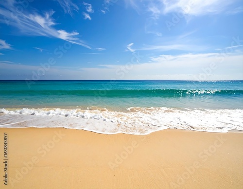 Idyllic tropical beach scene with clear blue sky and turquoise ocean waves