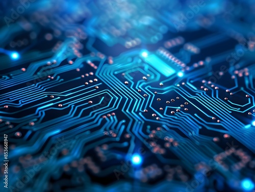 Illuminated Blue Circuit Board with Bokeh Effect Showcasing Digital Technology and Cyber Security
