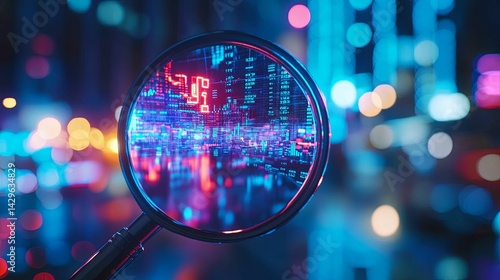Illuminated digital cityscape magnified through a magnifying glass.