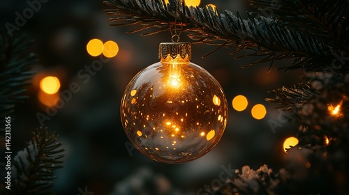 Illuminated Glass Ornament Hanging On Snowy Christmas Tree Branch