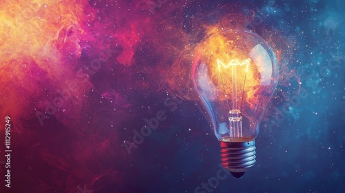Illuminated light bulb with colorful nebula background
