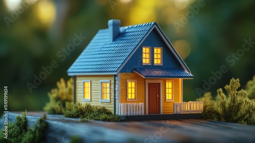 Illuminated miniature house model on wooden surface, surrounded by greenery.