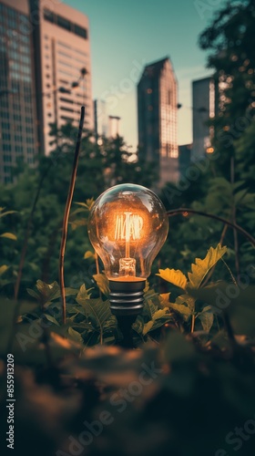 Illuminated vintage light bulb green foliage cityscape background dusk