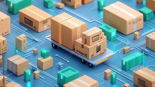 Illustrate an ecommerce order being processed from packaging to shipping for delivery, flat design, top view, supply chain theme, 3D render, Complementary Color Scheme