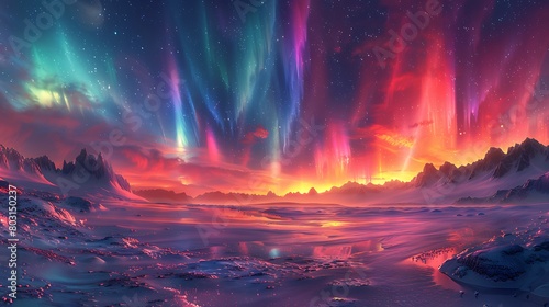 Illustrate an otherworldly cosmic aurora, with streams of luminous colors flowing over a barren planetary landscape, evoking a sense of wonder and alien beauty.