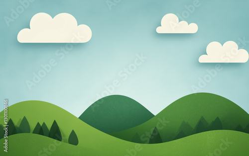 Illustrated forest landscape with green trees and bright blue sky