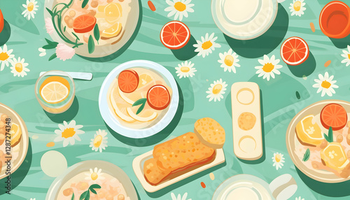 Illustration - Breakfast Table Decorated with Daisies, Oatmeal, Oranges, Lemons, and Toast