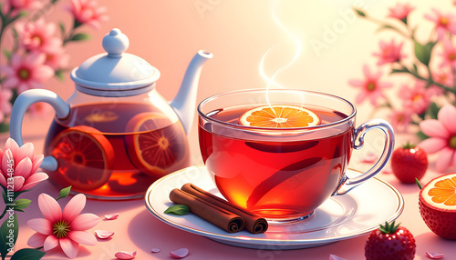 Illustration, colorful image of a fruit tea set with a teapot and a cup filled with bright red tea, decorated with cinnamon sticks and pieces of fruit, surrounded by blooming flowers and fresh fruits