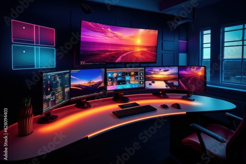 Illustration of a desk with three computer monitors and a keyboard, created using generative AI