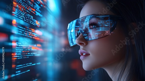 Illustration of a female IT student interacting with code in an augmented reality interface, AI-driven data analysis, cyber protection concepts, immersive learning