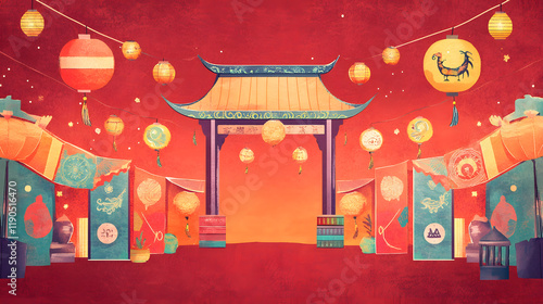 illustration of a festive market scene with lanterns, zodiac symbols, and colorful banners on a textured red background