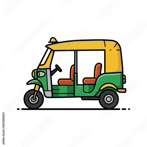 Illustration of a green and yellow auto rickshaw on a black background.