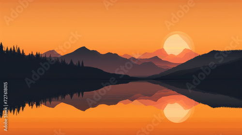 Illustration of a harmonious sunset on a calm lake with minimalist mountain contours, modern monochrome style