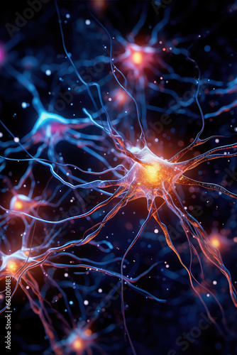 Illustration of a human nerve cell on a dark blue background with light effects. The nerve cell interacts by means of a light pulse. Generative AI