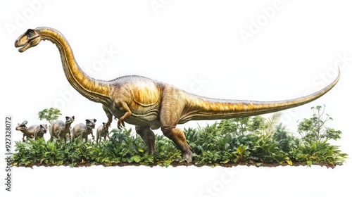 Illustration of a long-necked dinosaur walking among plants with several small mammal-like creatures beside it, depicting prehistoric life.