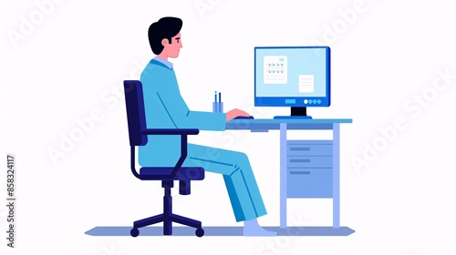 Illustration of a man working on a computer at a desk. Ideal for business, remote work, office productivity, and technology topics.
