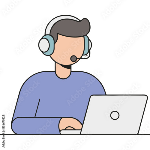 Illustration of a person wearing a headset and working on a laptop computer in a flat design style with a simple color palette