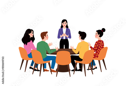 Illustration of a Professional Group Discussion with Diverse Individuals Engaging in a Collaborative Meeting Around a Table Setting